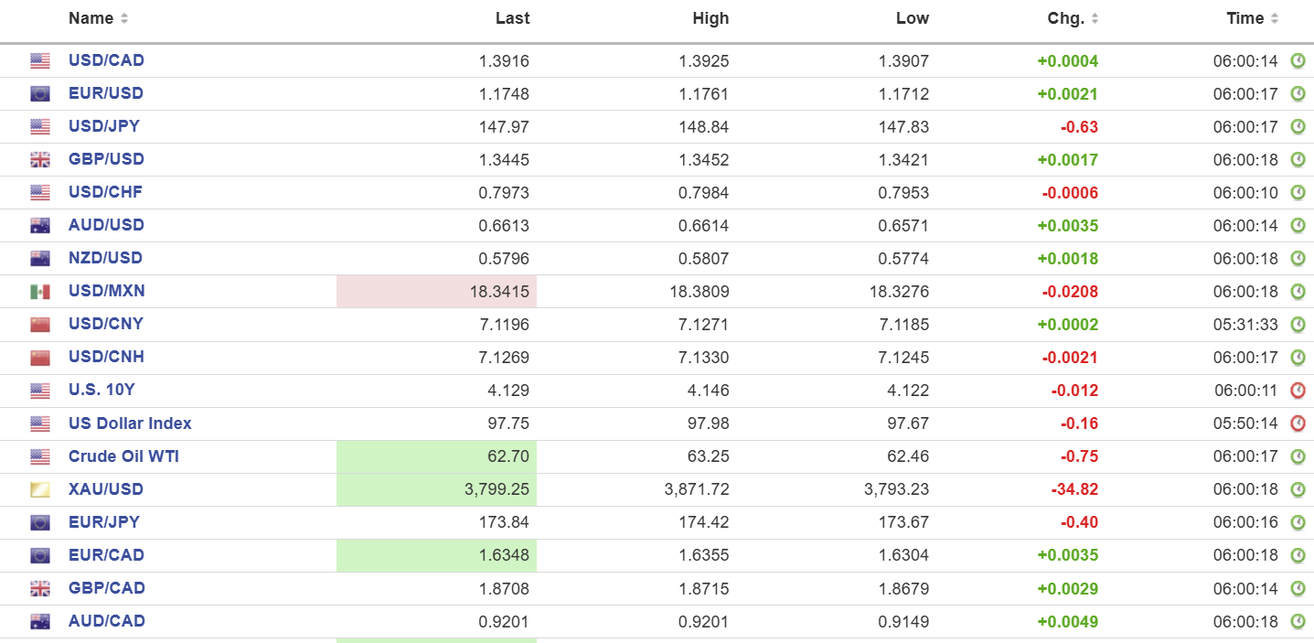 USDCAD open 1.3916, overnight range 1.3907-1.3925, close, 1.3917