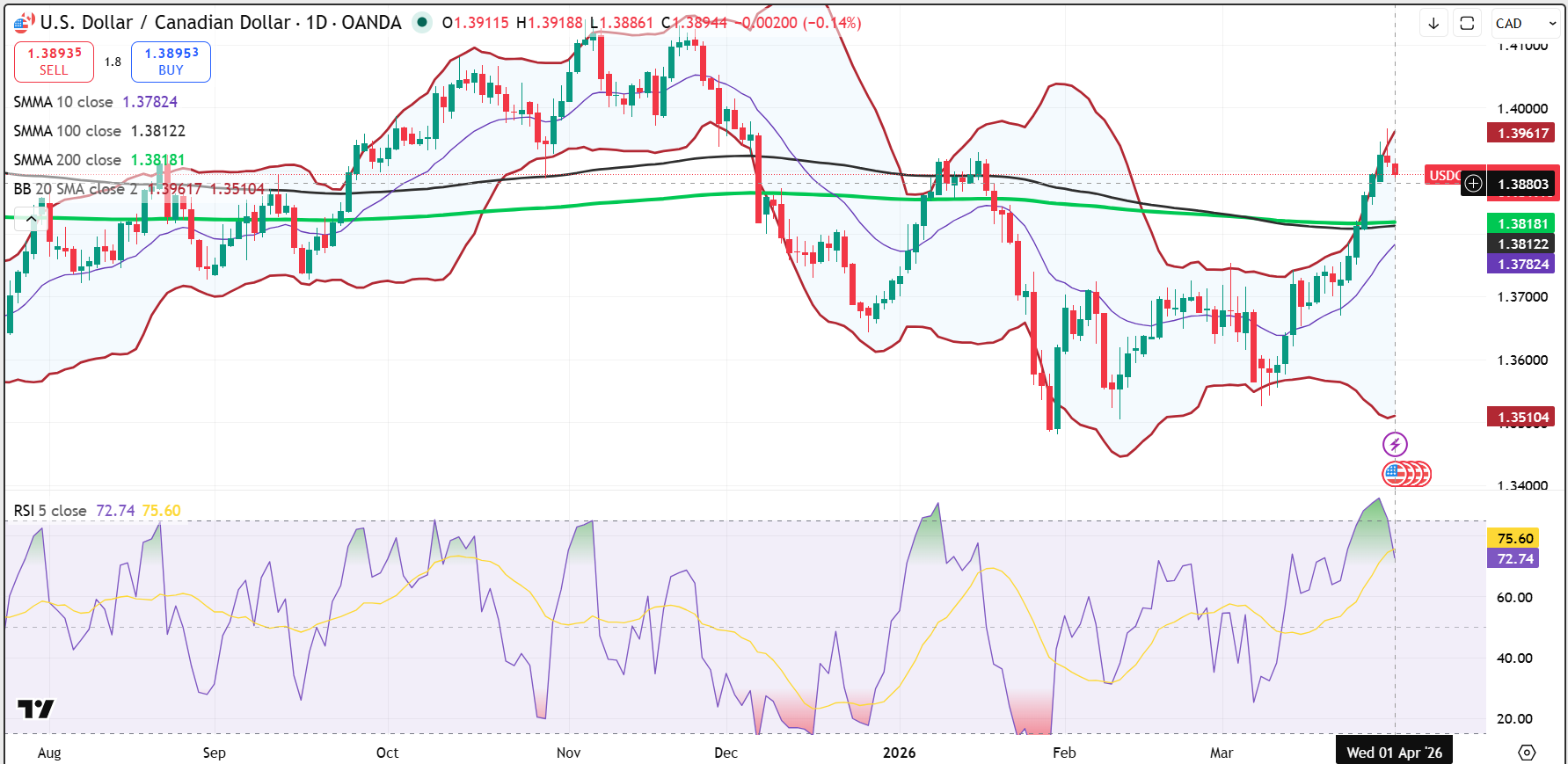 The intraday USDCAD technicals are bullish above 1.3860, but momentum has clearly cooled after tagging the upper Bollinger Band near 1.3950–1.3965. The sharp drop in the 4-hour RSI from overbought to the low 30s suggests a positioning flush rather than a trend reversal. A break above 1.3965 targets 1.4000, while a move below 1.3860 targets 1.3810.