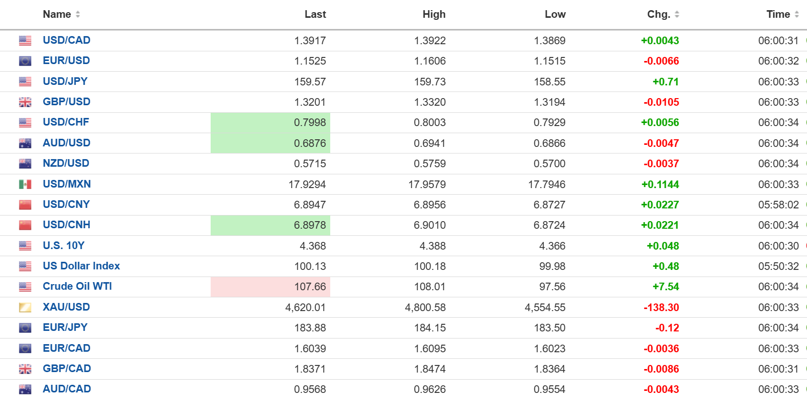 FX  open high low 6:00 am
