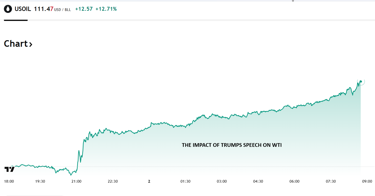 WTI surged from 98.90 to 107.82 on the news, exacerbated by Iran’s reply which included fresh missile and drone attacks on Israel, Iraq, and UAE. Trump did not say anything about getting the Strait of Hormuz reopened.