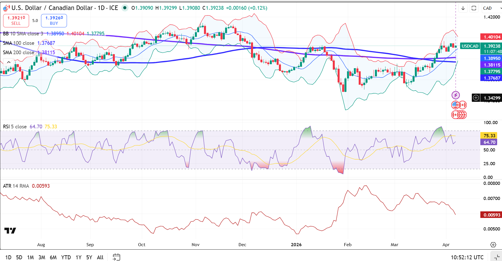 The medium-term USDCAD outlook has shifted to neutral-bullish following the February low near 1.34 and a break above the 100- and 200-day moving averages (1.3768–1.3811), which are not strong support. Momentum remains positive but is slowing, with RSI near 65 and ATR declining, signalling consolidation. Resistance at 1.4000–1.4050 caps gains, while support at 1.3810 underpins the trend. Expect a 1.3850–1.4050 range with an upside bias unless 1.3810 breaks decisively.