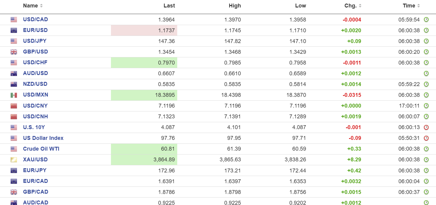 As of 5:50 am PDT, European equities are posting gains. The UK FTSE 100 index has risen by 0.53%, but the French CAC-40 index and German Dax have turned earlier gains into losses. The former is down 0.09%, and the latter has shed 0.24%. S&P 500 futures are up 0.08%, and the U.S. dollar index (DXY) is 97.81. Gold (XAUUSD) is 3870.61 while the U.S. 10-year Treasury yield is 4.09%.
