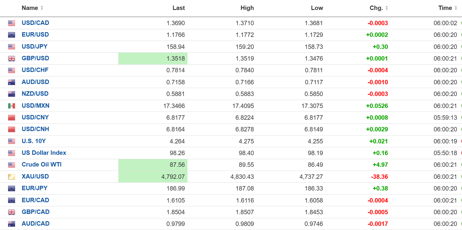 FX  open high low 6:00 am