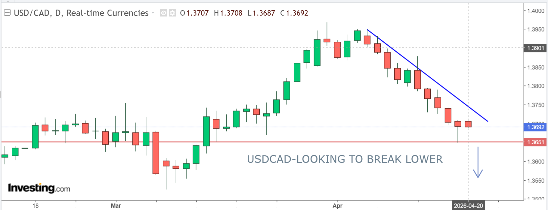 For today, USDCAD support is at 1.3650 and 1.3605. Resistance is at 1.3710 and 1.3730.