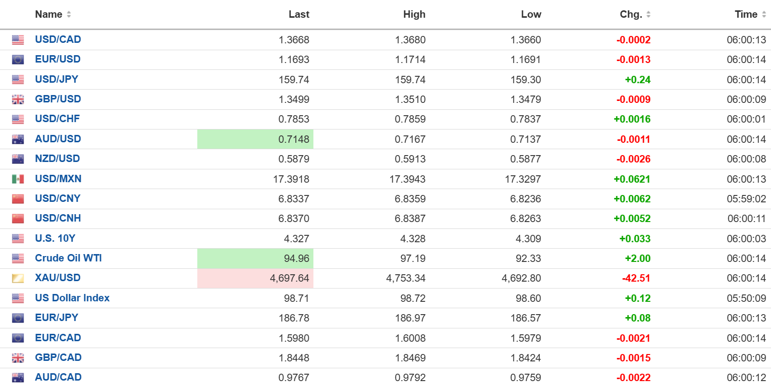 As of 5:40 am PT, the French CAC 40 has gained 0.57% while the UK FTSE 100 has lost 0.50% and the German DAX has dropped 0.18%. S&P 500 futures are down 0.21%, the 10-year Treasury yield is 4.302%, the DXY is 98.69 and gold (XAUUSD) is 4741.00