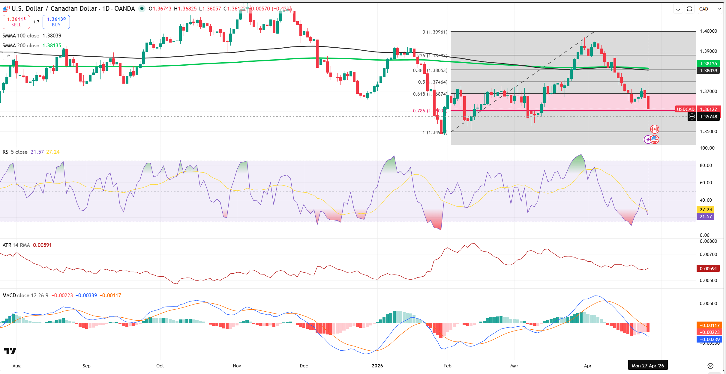 The 38.2% Fibonacci retracement at 1.3805 sits directly on top of those moving averages, making 1.3804-1.3814 a formidable confluence resistance wall. That said, the daily RSI at 21 signals deeply oversold conditions. MACD remains negative with no crossover signal, keeping the path of least resistance pointed lower.