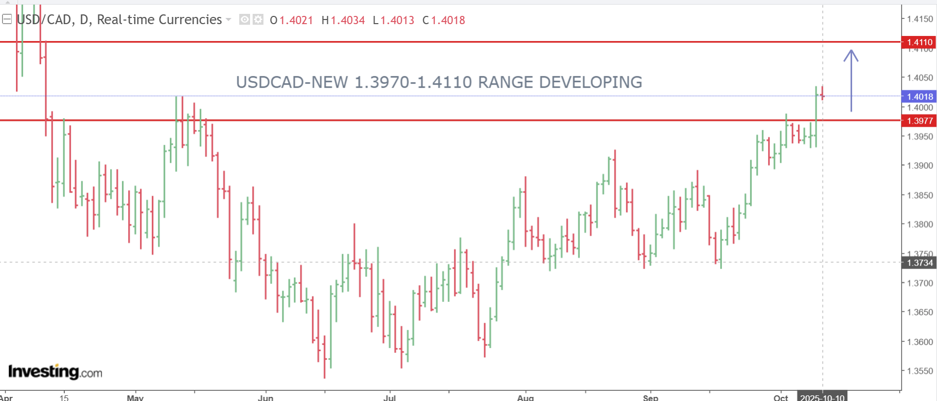The intraday technicals are mildly bullish and improving. USDCAD has broken and held above the 200-day moving average at 1.3975, confirming a near-term shift in momentum. However, with the RSI hovering above 80, the move looks stretched, suggesting a modest correction is possible. A sustained push above 1.4065 would extend the rally toward 1.4110, while a move below 1.3970 would expose 1.3920 and argue for more consolidation.