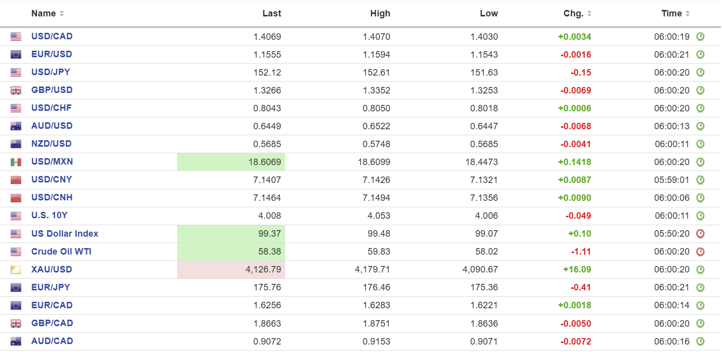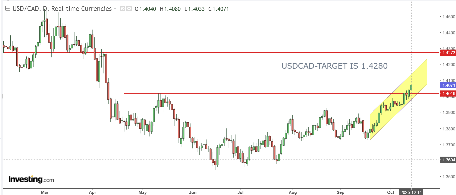 USDMXN rode a rollercoaster between Friday and today. Prices spiked to 18.6344 on Friday after Trump’s 100% tariff on China threat, then dropped to 18.4196 Monday (when Mexican markets were closed for Columbus Day) before rising to 18.6279 in New York. Safe-haven demand for dollars and renewed global trade tensions have fueled the moves.