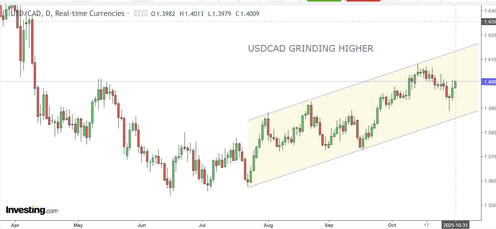 Last Friday, USDCAD closed in NY at 1.4003 and this Friday it opened around the same level which just goes to prove, miss a week and you don’t miss anything. The Fed did the expected and cut its benchmark rate by 25 bps, and even though Fed Chair Powell said that a December cut is far from a done deal, the odds are still 66.8% for a cut.