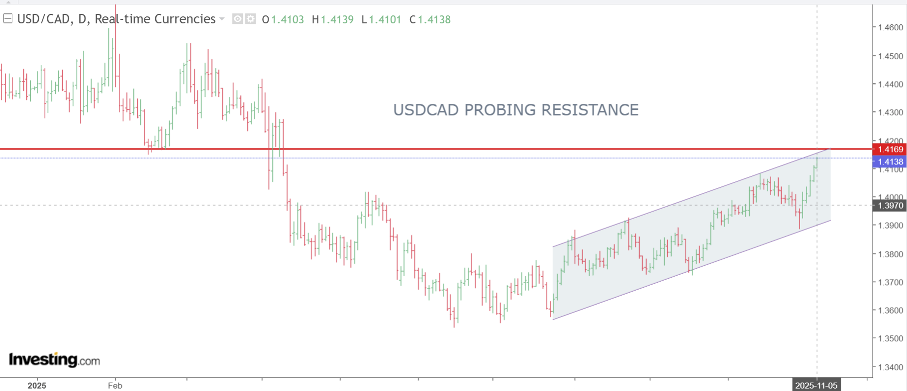 GBPUSD remains under pressure and traded in a 1.3010–1.3053 range. Widespread US dollar demand, ongoing UK budget angst, and rising expectations for a Bank of England rate cut in December are fueling the sell-off. A move below 1.3000 could extend losses to the April low in the 1.2705 area.