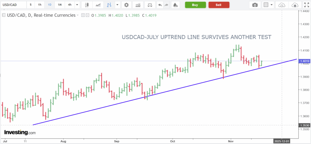USDCAD is ignoring domestic influences including economic data and the latest Canadian government budget. Traders are focused on Wall Street and the latest tech stock correction because of chatter about inflated AI spending.  Nvidia’s earnings are released at the end of the day, after the 2:00 pm release of the October 29 FOMC minutes. That suggests traders will stay close to home leaving USDCAD inside its well-traveled 1.3960-1.4060 range.