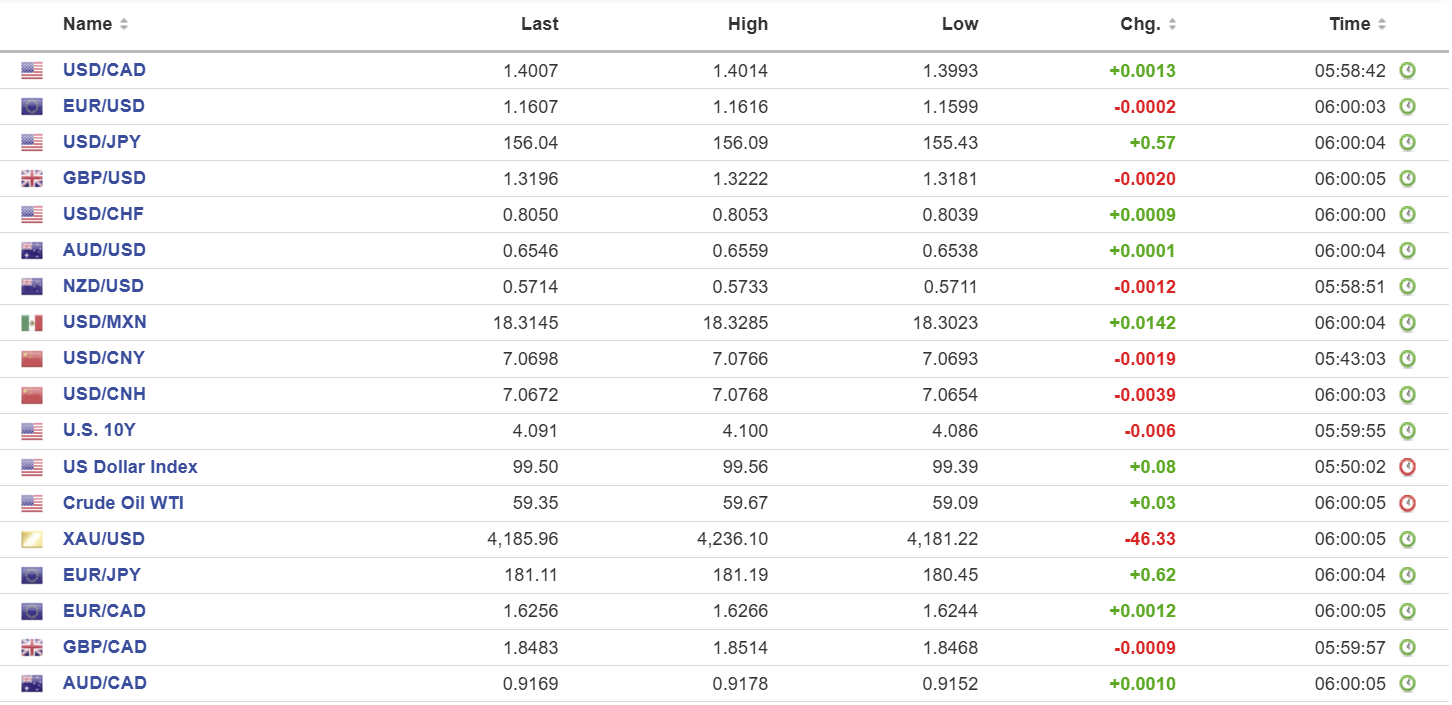 As of 7:15 am, European bourses are trading positively. The German DAX is up 0.74%, the French CAC-40 has gained 0.33%, and the FTSE 100 index is up 0.28%. The US Dollar Index (DXY) is 99.47, the US 10-year Treasury yield is 4.11%, and gold (XAUUSD) is $4202.17.