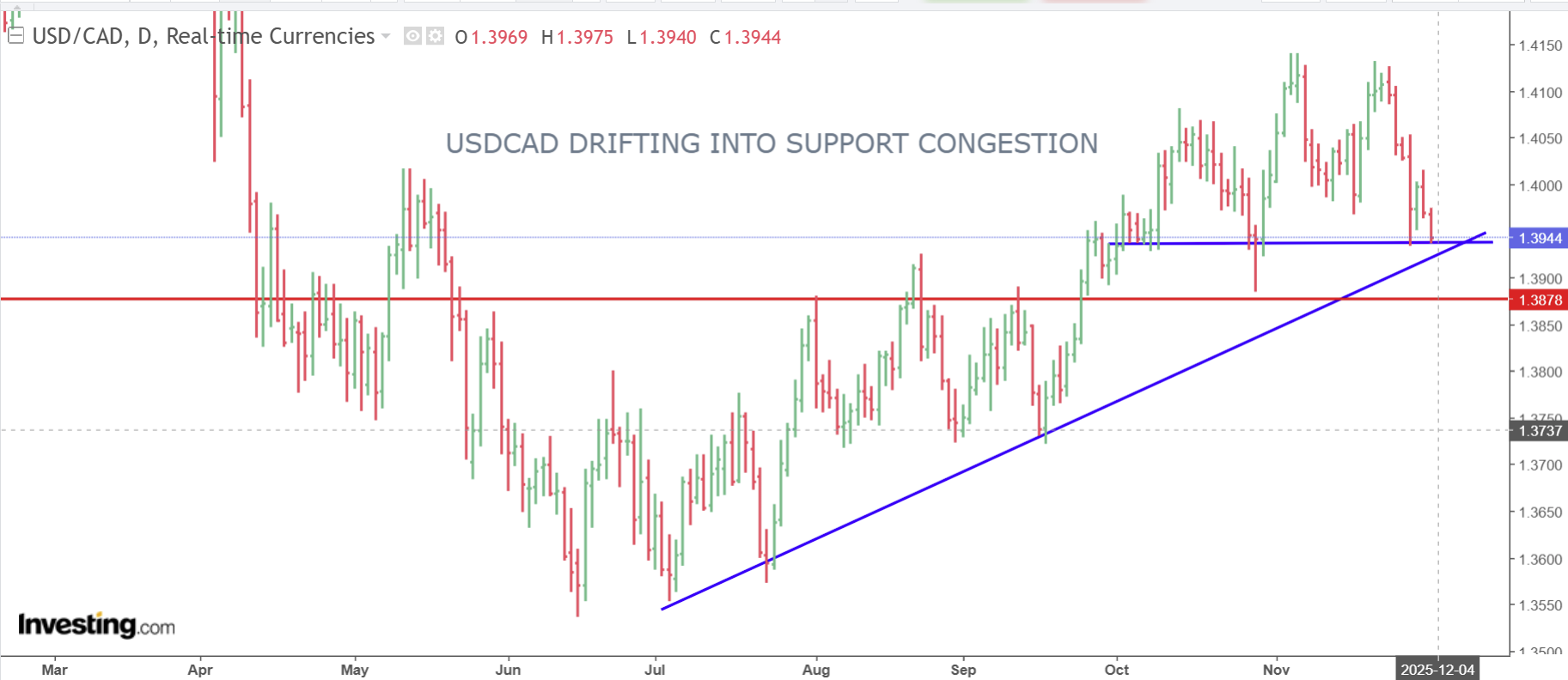 USDCAD is riding the bearish dollar wave due to divergent monetary policy outlooks for December BoC and Fed meetings. The Fed is almost guaranteed to cut its benchmark rate by 25 bps while the BoC leaves its rate unchanged. Traders are also looking to 2026 and expecting that Trump’s pick for Fed Chair will be an advocate for easy monetary policies.