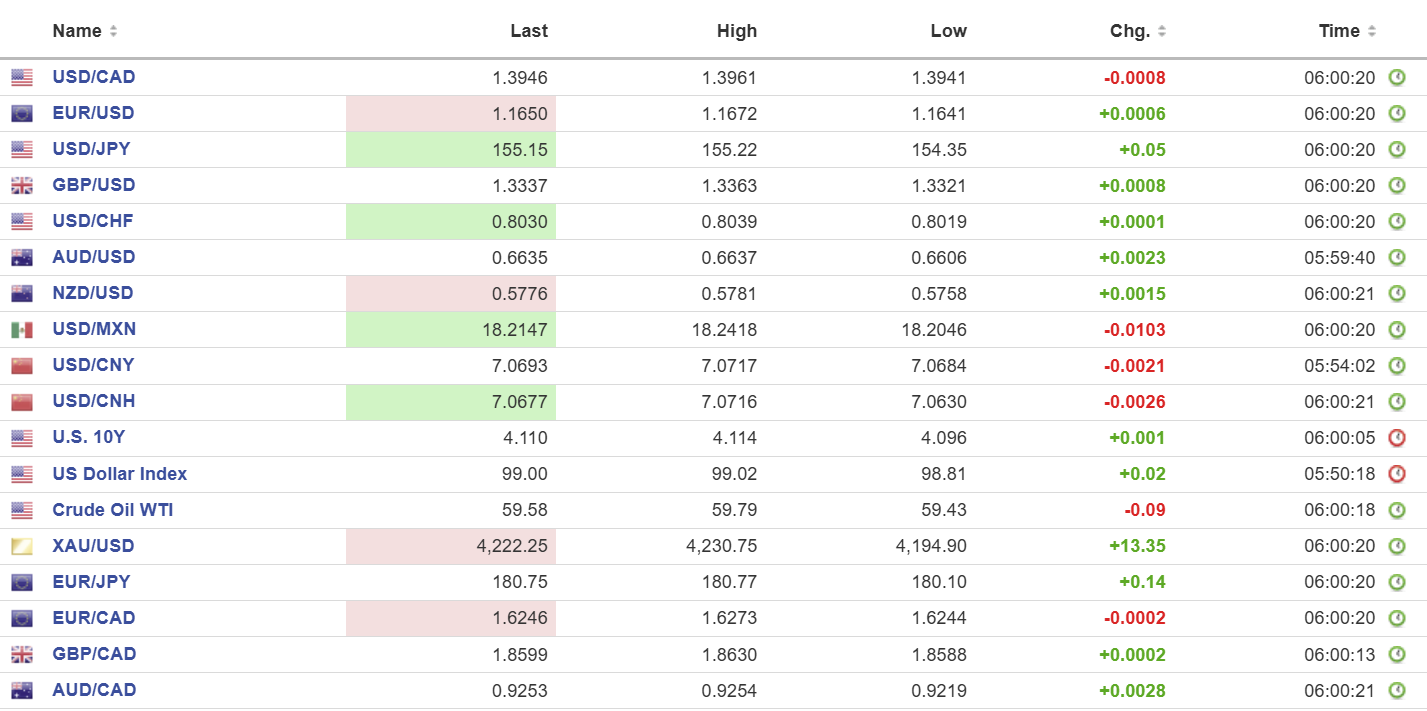 As of 7:05 am, European markets are modestly higher. The German DAX is up 0.61%, the French CAC-40 has gained 0.33%, the FTSE 100 is up 0.09%, and S&P 500 futures are up 0.20%. The US Dollar Index (DXY) is 99.00, the US 10-year Treasury yield is 4.112%, and gold (XAUUSD) is $4,225.18.
