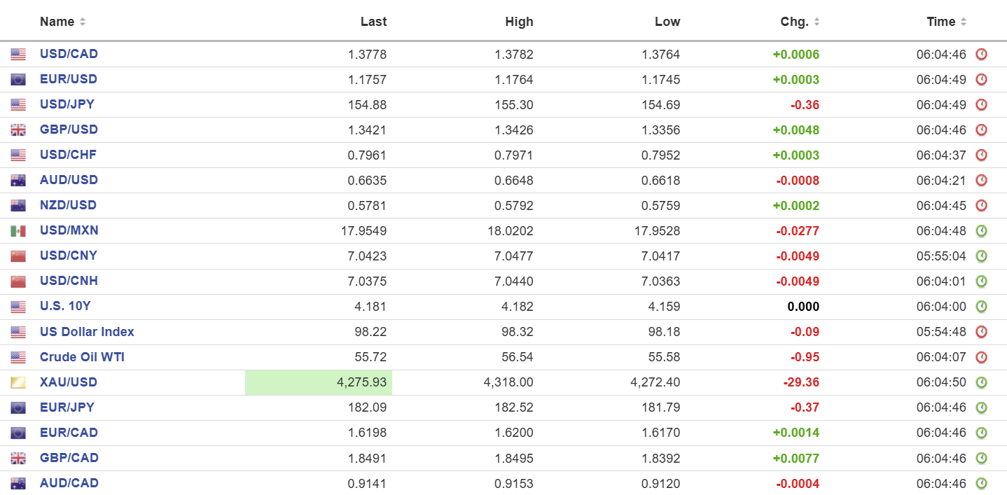 As of 5:30 am PT, European bourses are in the red. The UK FTSE 100 is down 0.51%, the French CAC 40 is flat and the German DAX has fallen 0.35%. S&P 500 futures are down 0.12%, the US Dollar Index is 98.06, the U.S. 10-year Treasury yield is 4.165%, and gold (XAUUSD) is 4308.31