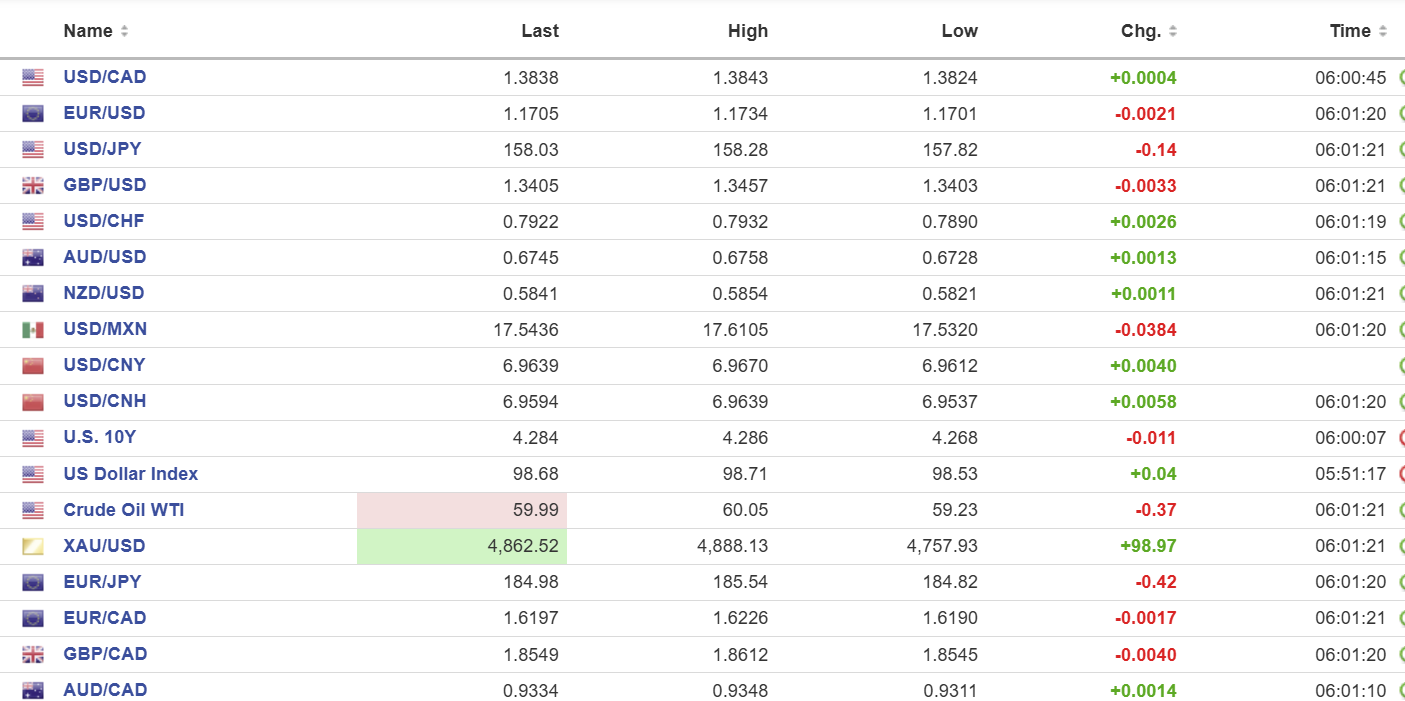 FX markets traded mixed in narrow ranges, global equity indices traded negatively, the 10-year Treasury yield was steady, but gold prices surged by 2.7% to a peak of 4888.13.