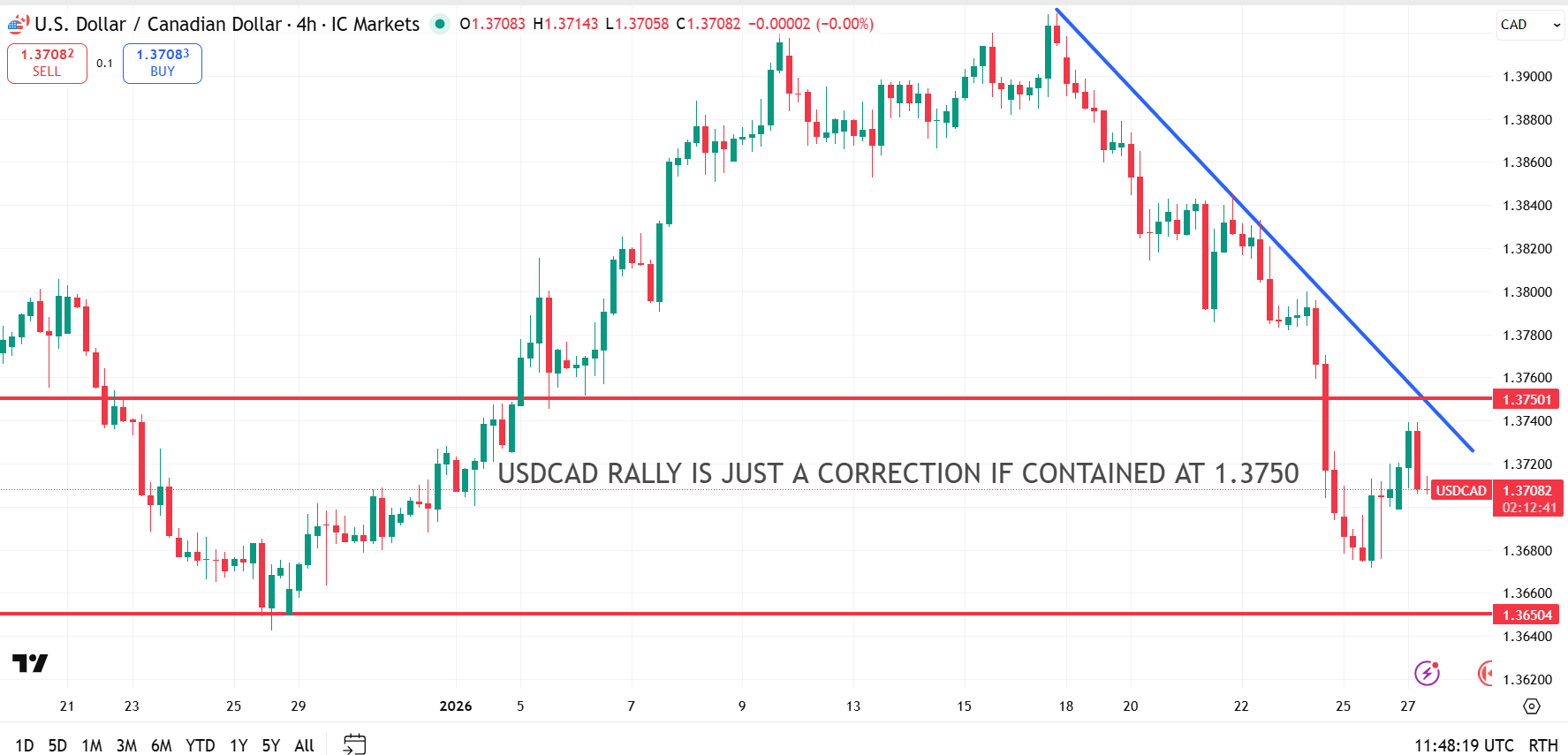 The medium-term technicals are unchanged from yesterday. USDCAD has broken its prior uptrend and remains vulnerable. A corrective bounce could extend toward 1.3800, while a failure to hold above 1.3650 would open the door to a deeper move toward 1.3600.