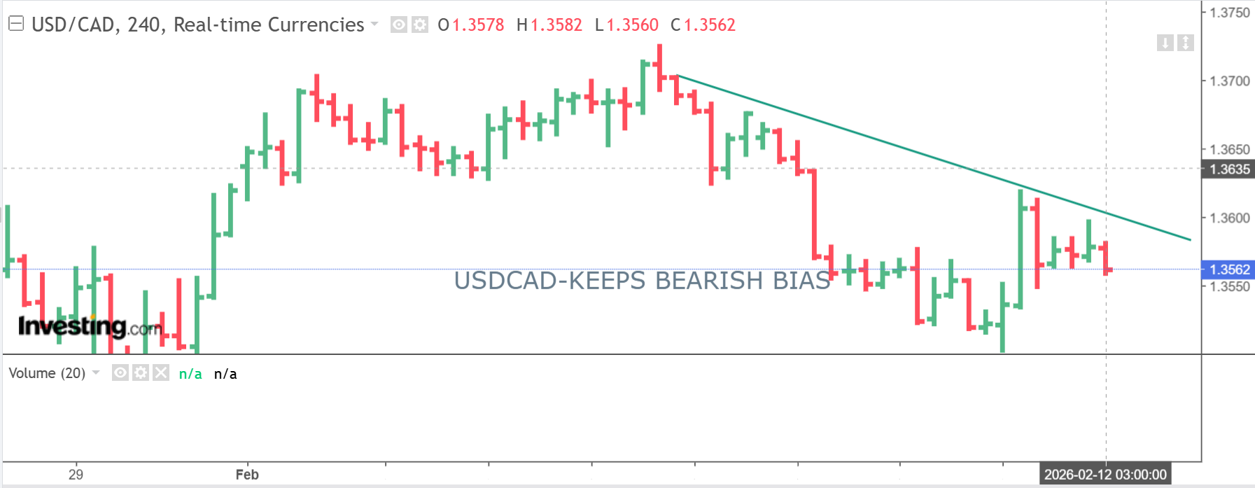 The intraday USDCAD technicals are bearish while prices are below 1.3590, while momentum is neutral to soft, with the 4-hour RSI at 48.4 and turning higher but still below the 60 zone that would signal upside traction. A move above 1.3610 would ease immediate downside pressure and suggest a retest of the 1.3650–1.3660 area.